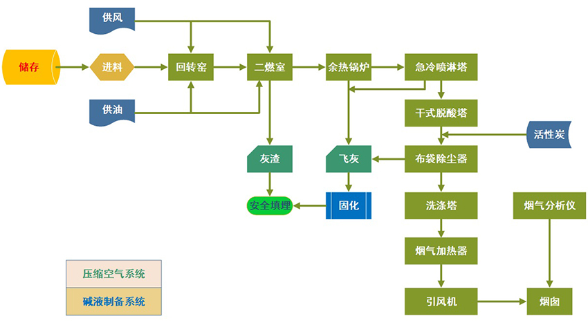 焚燒采用回轉窯+二燃室工藝,煙氣凈化采用急冷塔+脫酸塔+布袋除塵器工藝,配置先進的自動控制系統,焚燒煙氣達標排放,殘渣進入安全填埋場,飛灰進入固化車間固化后填埋。醫療廢物進行全過程管理,設置冷藏庫和周轉箱消毒系統,醫療廢物則通過進料機構進入焚燒系統處理。